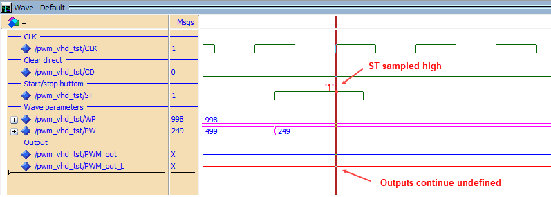 Fig. 14. Gate-level simulation working correctly. Internal signals must be selected using the synthesised technology schematic. What is the reason that this time the circuit simulation works correctly? |