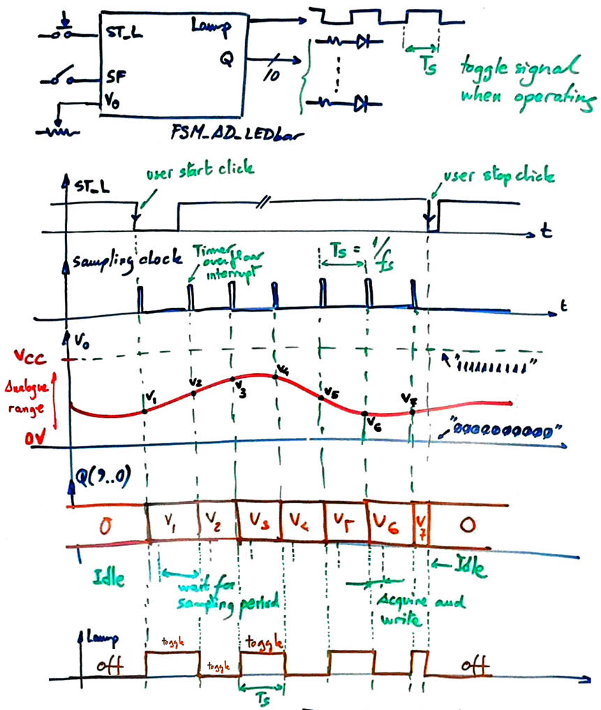 Acquiring analogue signals: FSM, A/D, LED bar, MCC |