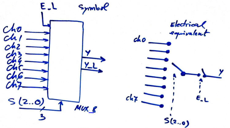 Fig. 4. Multiplexer expansion idea. This is an architecture proposed for the MUX_8 organised as a hierarchical design containing components of the same kind (MUX_2, etc., logic gates and wires (signals):