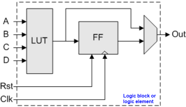 Listed as the 14th of our plans for implementing logic functions, in CSD we will use the method of ROM/RAM memory or look-up table (LUT) for implementing combinational circuits. This is yet another plan C2 like the MoD or the MoM. This strategy is used in the fabric of FPGA logic elements for storing truth tables with a granularity of 4-input and a single output (RAM_24x1).