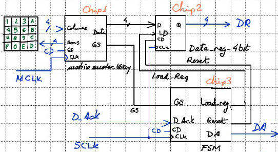 Fig 4. Architecture of the 16-key matrix keyboard encoder FSM and some other planning ideas (click to zoom). |